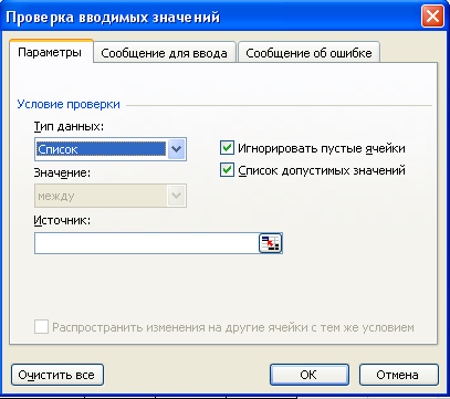 Поля «Розряд» та «Професія» заповнюються Данные → Проверка у віні «Проверка вводимых значений», закладка «Параметры» → «Тип данных»(Список), а в «Источник» можна казати діапазон даних або ввести текст (рис. 1.1).