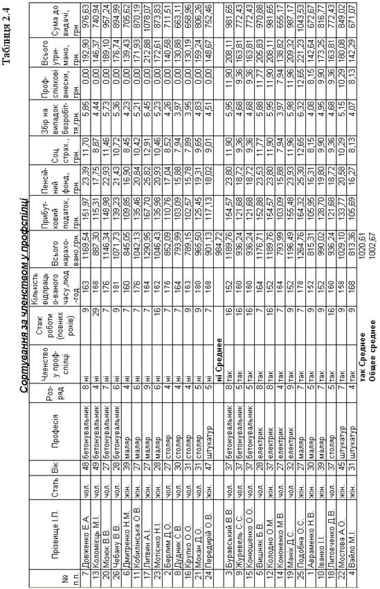 4). Сортування. За результатами розроблення відомості про робітників та таблиці розподілу створити таблицю з наступними полями: № п.п., прізвище та ініціали, стать, вік, професія, розряд, членство у профспілці, стаж роботи, кількість відпрацьованого часу, всього нараховано; прибутковий податок, відрахування до пенсійного фонду, відрахування на соцстрахування, збір на випадок безробіття, профспілкові внески, всього утримано, сума до видачі. Виконати сортування за сплаченим прибутковим податком .