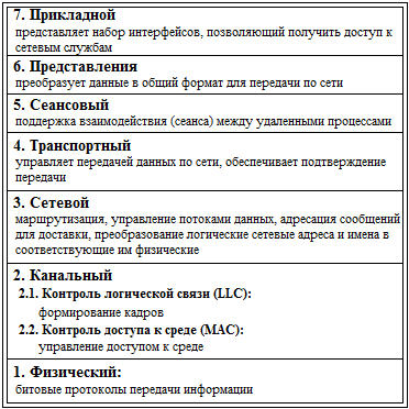 | 7 | Прикладной | напр. HTTP, SMTP, SNMP, FTP, Telnet, SSH, SCP, SMB,NFS, RTSP, BGP |