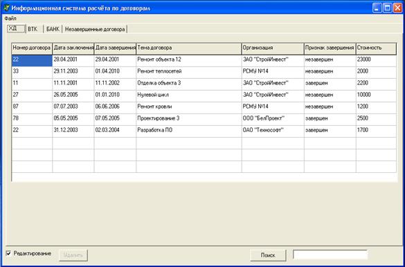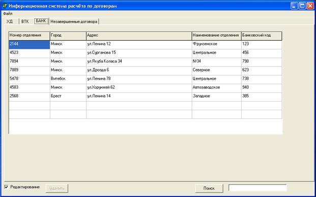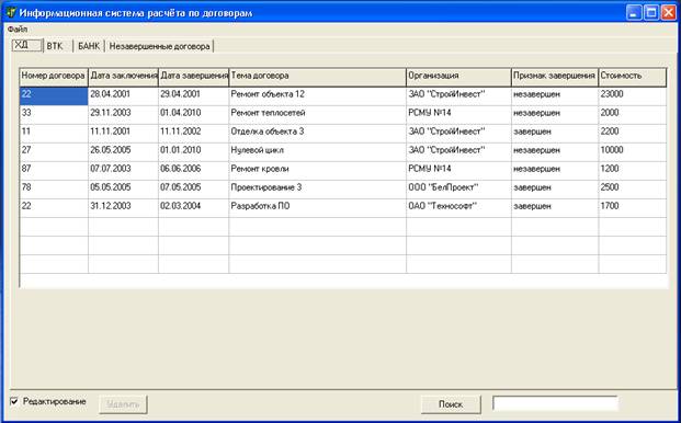 - компонент PageControl1 – содержит вкладки TabSheet 1÷4 на которых отражены данные (соответственно “ХД”, “ВТК”, “БАНК” и “Незавершенные договора”).