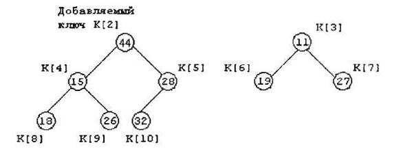 Предположим, что дана пирамида с элементами К[3], К[4], ..., К[10] нужно добавить новый элемент К[2] для того, чтобы сформировать расши-ренную пирамиду К[2], К[3], К[4], ..., К[10]. Возьмем, например, исходную пирамиду К[3], ..., К[10], покачанную на рисунке 3, и расширим эту пирамиду «влево», добавив элемент К[2] =44.