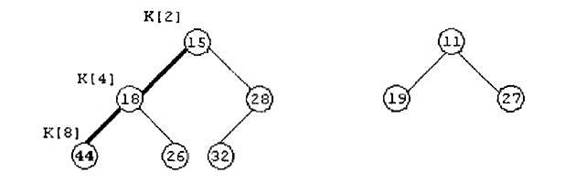Добавляемый ключ К[2] просеивается в пирамиду: его значение сравнивается с ключами узлов-сыновей, т.е. со значениями 15 и 28. Если бы оба слюча-сына были больше, чем просеиваемый ключ, то последний остался бы на месте, и просеивание было бы завершено. В нашем случае оба ключа-сына меньше, чем 44, следовательно, вставляемый ключ меняется местами с наименьшим ключом в этой паре, т.е. с ключом 15. Ключ 44 записывается в элемент К[4], а ключ 15 - в элемент К[2]. Просеивание продолжается, поскольку ключи-сыновья нового элемента К[4] оказываются меньше его - происходит обмен ключей 44 и 18. В результате получаем новую пирамиду, показанную на рисунке 4.