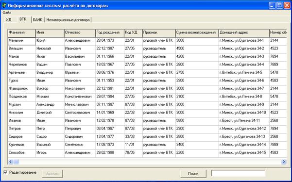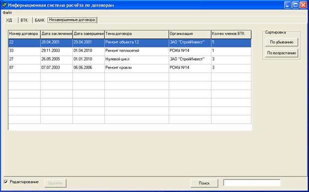 Компоненты TabSheet 1÷4 содержат в себе элементы таблицы (соответственно “XDgrid”, “WTKgrid”, “BANKgrid” и “NDgrid”). Кроме того, TabSheet 4 содержит ещё компонент GroupBox1 c кнопками btnSort1 и btnSort2 для сортировки списка незавершенных договоров по возрастанию и по убыванию количества членов ВТК.