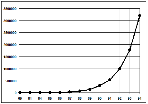 Спустя некоторое время TCP/IP был адаптирован в обычный, то есть в общедоступный стандарт, и термин Internet вошел во всеобщее употребление. В 1983 году из ARPANET выделилась MILNET, которая стала относиться к Defence Data Network (DDN) министерства обороны США. Термин Internet стал использоваться для обозначения единой сети: MILNET плюс ARPANET. И хотя в 1991 году ARPANET прекратила свое существование, сеть Internet существует, ее размеры намного превышают первоначальные, так как она объединила множество сетей во всем мире. Диаграмма 1 иллюстрирует рост числа хостов, подключенных к сети Internet с 4 компьютеров в 1969 году до 3,2 миллионов в 1994. Хостом в сети Internet называются компьютеры, работающие в многозадачной операционной системе (Unix, VMS), поддерживающие протоколы TCP\IP и предоставляющие пользователям какие-либо сетевые услуги.