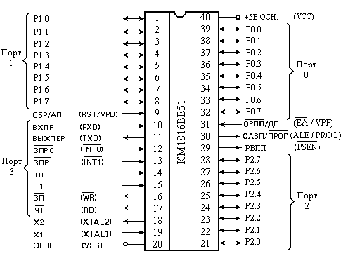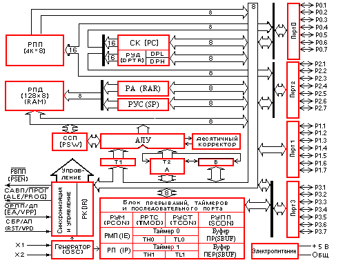 ОМЭВМ представляют собой приборы, конструктивно выполненные в виде одной БИС и включающие в себя все устройства, необходимые для реализации цифровой системы управления минимальной конфигурации: процессор, запоминающее устройство данных, запоминающее устройство команд, внутренний генератор тактовых сигналов, а также программируемые интегральные схемы для связи с внешней средой. Использование ОМЭВМ в системах управления обеспечивает достижение исключительно высоких показателей эффективности при столь низкой стоимости (во многих применениях система может состоять только из одной БИС ОМЭВМ), что им, видимо, нет в ближайшем времени альтернативной элементной базы для построения управляющих и/или регулирующих систем, В настоящее время более двух третей мирового рынка микропроцессорных средств составляют именно БИС ОМЭВМ. В некоторых публикациях однокристальную микроЭВМ (ОМЭВМ) называют “микроконтроллер”. Обосновывается это тем обстоятельством, что такие микросхемы имеют незначительные емкости памяти, физическое и логическое разделение памяти программ (ПЗУ) и памяти данных (ОЗУ), упрощенную и ориентированную на задачи управления систему команд, примитивные методы адресации команд и данных. Специфическая организация ввода-вывода информации предопределяет область их применения в качестве специализированных вычислителей, включенных в контур управления объектом или процессом. Структурная организация, набор команд и аппаратно-программные средства ввода-вывода информации этих микросхем лучше всего приспособлены для решения задач управления и регулирования в приборах, устройствах и системах автоматики, а не для решения задач обработки данных. Указанные выше соображения отражают технический уровень ОМЭВМ в настоящий момент.