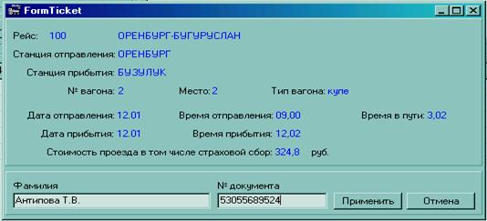 После заполнения данных пассажира (фамилии, имени, отчества, номера документа, удостоверяющего личность) происходит регистрация пассажира на данный рейс и формируется проездной документ, в котором указываются рейс, вычисленные ранее стоимость билета, время пути, время отправления и прибытия, дата прибытия, данные пассажира, пункт отправления и пункт следования.