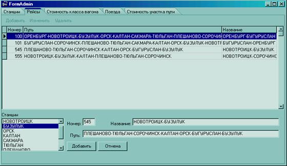 В данном окне администратор может добавлять новые рейсы, внося их номер и полный путь, а название рейса формируется автоматически – из начальной заданной станции и конечной прописанной в пути.