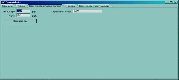 Появляется форма администратора с вкладками «Станции», «Рейсы», «Стоимость класса вагона», «Поезда», «Стоимость участка пути», форма изображена на рисунке 8.