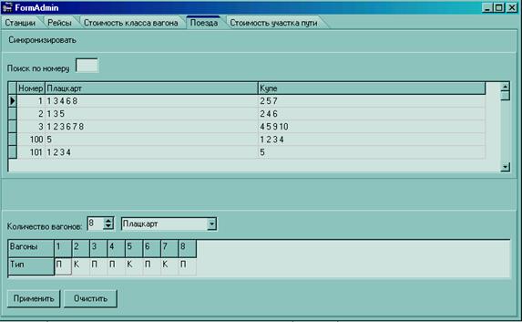 Рассмотрим вкладку «Поезда», представленную на рисунке 10. Здесь отмечаются сколько вагонов находится в составе и под каким номером какие типы вагонов. После нажатия кнопки «Применить», информация заносится в таблицу.