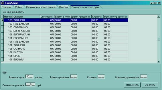 На вкладке «Стоимость участка пути», изображённой на рисунке 11, администратор вносит необходимые данные: время в пути, время прибытия, стоянка, время отправления, стоимость участка. После нажатия кнопки «Применить», вне-сённые данные отображаются в верхней таблице.