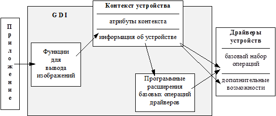 Все средства вывода в Windows относятся к графическому интерфейсу устройств (GDI). GDI представляет собой библиотеку функций для выполнения графического вывода на различных устройствах, не только на дисплее.