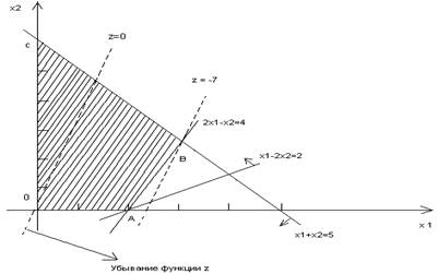 Графическое решение (см. рисунок) показывает, что точка минимума – это точка (3,2), где z = -7. Вырожденность (при обращении нескольких переменных в 0, базис называют вырожденным) возникает, поскольку прямые, соответствующие ограничениям, пересекаются в одной точке (2,0). В нашей задаче в вершине пересекаются три прямые (обычно вершина является пересечением всего двух прямых).
