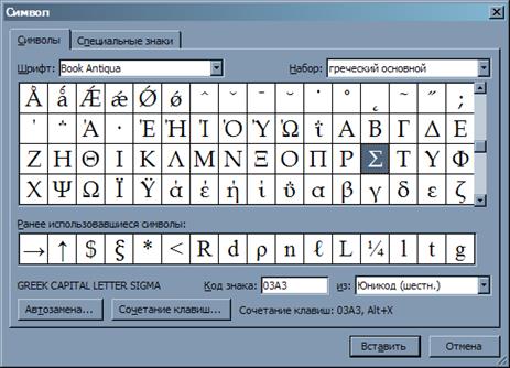 Для того щоб у текстовому редакторі Microsoft Word вставити в текст грецькі літери необхідно скористатись пунктом меню "Вставка"-"Символ". У вікні, яке з’явиться на екрані можна вибрати не тільки літери грецького алфавіту, а й будь-які інші символи, яких немає на стандартній клавіатурі. Також за допомогою цього пункту меню можна вибрати різноманітні примітивні графічні елементи. Для цього необхідно вибрати відповідний системний шрифт із випадаючого пункту меню "Шрифт". Також можна вибрати набір символів у випадаючому списку, який знаходиться справа від випадаючого списку "Шрифт". Функціональність текстового редактора Microsoft Word на цьому не закінчується. Він також дозволяє провести автоматичну заміну тих чи інших символів по всьому тексту документа. Для цього необхідно натиснути одноіменну клавішу "Автозаміна"