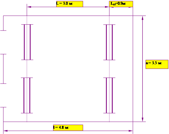 Располагаем светильники вдоль стороны помещения с окном. Расстояние между стенами и крайним рядом светильников считаем по формуле: