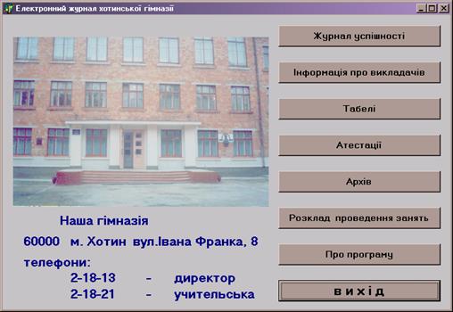 Призначення: Ведення обліку відвідування занять учнями Хотинської гімназії, атестація учнів, виведення рейтингових оцінок, генерування потрібних звітів, швидкий доступ до потрібної інформації.