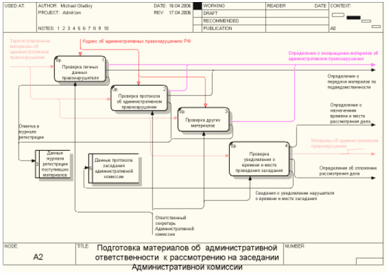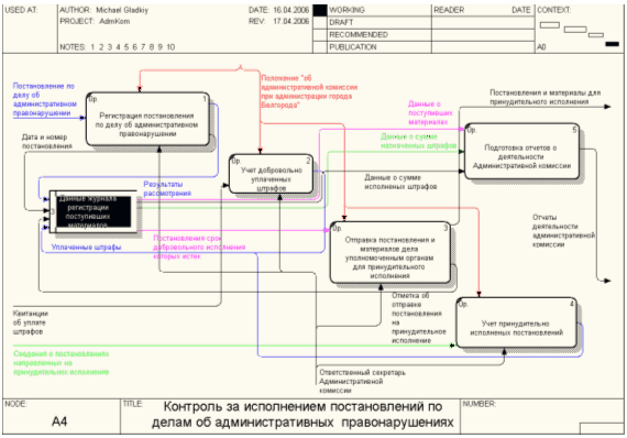 На сегодняшний день для обеспечения работы административной комиссии используется некомпьютерная информационная система, состоящая из журналов учета входящей документации, исходящей документации, учета уплаченных штрафов, готовых бланков документов и архива рабочей документации. Обработка входящей документации, составление отчетов, другой исходящей документации, поиск необходимой информации и ведение статистики, производится вручную. Понятно, что должностные лица ответственные за подготовку материалов к рассмотрению на заседании комиссии большую часть рабочего времени тратят на заполнение вручную бланков различных документов, причем данные, вносимые в бланки, повторяются. Так только фамилию нарушителя необходимо написать пять раз (в журнале регистрации входящей документации, в повестке, в бланке постановления по делу об административном правонарушении, в протоколе заседания административной комиссии, на почтовом конверте). Другие личные данные правонарушителя (дата рождения, место рождения, место жительства, место работы) необходимо написать минимум по два раза. Так же минимум в двух документах (постановлении по делу об административном правонарушении и протоколе заседания административной комиссии) должны содержаться: информация о правонарушении, обстоятельства по делу, установленные на заседании комиссии, и информация о наказании, назначенном нарушителю. Отметку об исполнении наказания тоже необходимо сделать в двух местах: в журнале учета уплаченных штрафов и в журнале учета входящей документации. Неисполненное постановление через месяц после его вынесение направляется судебным приставам-исполнителям для принудительного исполнения, вместе с постановлением необходимо отправить сопроводительное письмо, в котором должны содержаться атрибуты постановления (порядковый номер, дата вынесения, фамилия нарушителя). Следует учесть, что еженедельно в административную комиссию поступает около ста материалов об административных правонарушениях, таким образом, нетрудно подсчитать, сколько операций необходимо произвести и потратить времени только для их надлежащего оформления. Кроме того, в каждом случае необходимо проверить правильность оформления поступивших материалов, исследовать доказательства и принять законное и обоснованное решение, с учетом всех обстоятельств. Результаты работы комиссии должны отражаться в различных отчетах и статистических данных. Подготовка отчетов достаточно сложная задача при использовании некомпьютерной информационной системы. Необходимо в журнале учета входящей документации вручную посчитать количество поступивших, рассмотренных, возвращенных материалов, сумму наложенных и взысканных штрафов и т.п. Такой же сложной является задача анализа исполнения постановлений, направленных приставам-исполнителям.