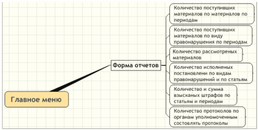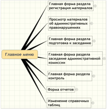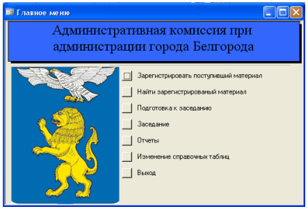 Как видно из рисунка 4.2.1, во главе иерархии лежит главная форма "Главное меню", которая затем разветвляется на следующие формы: "Главная форма раздела регистрация материалов", "Главная форма раздела подготовка к заседанию", "Главная форма раздела заседание административной комиссии", "Главная форма раздела контроль", "Форма отчетов", "Изменение справочных таблиц". Проект формы главного меню будет выглядеть так (рис 4.2.3)