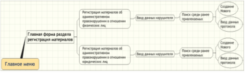 При регистрации должны быть внесены данные о нарушителе. Так как многие нарушители могли раннее привлекаться к административной ответственности, есть вероятность, что их данные уже хранятся в базе, поэтому целесообразно сначала организовать поиск среди уже зарегистрированных нарушителей (рис.4.2.5). Организация такого поиска необходима еще и для дальнейшего рассмотрения дела, ведь если человек привлекался ранее к административной ответственности за то же нарушение, то в этот раз наказание должно быть жестче. Если поиск не дал результатов, то можно зарегистрировать нового нарушителя (рис. 4.2.6). Затем следует ввести данные протокола об административном правонарушении (рис. 4.2.7). Исходя из выше перечисленных требований была разработана следующая структура модуля "регистрация материалов" (см. рис. 4.2.4)