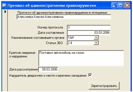 Рис.4.2.7. Проект формы Внесения данных протокола об административном правонарушении.
