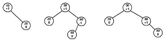 В АВЛ - дереве показатель сбалансированности должен быть в диапазоне [-1, 1]. На рисунке 3 изображены АВЛ - деревья с пометками -1, 0 и +1 на каждом узле, показывающими относительный размер левого и правого поддеревьев.