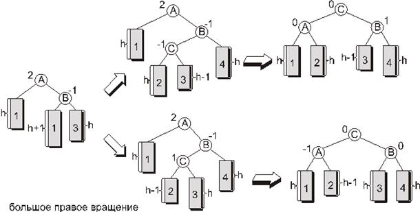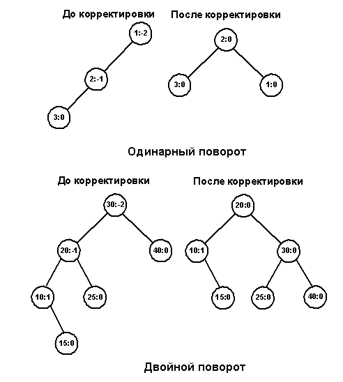Пусть имеется дерево, сбалансированное всюду, кроме корня, а в корне показатель сбалансированности по модулю равен 2 - м. Такое дерево можно сбалансировать с помощью одного из четырех вращений. При этом высота дерева может уменьшиться на 1. Для восстановления баланса после удаления/добавления вершины надо пройти путь от места удаления/добавления до корня дерева, проводя при необходимости перебалансировку и изменение показателя сбалансированности вершин вдоль пути к корню.