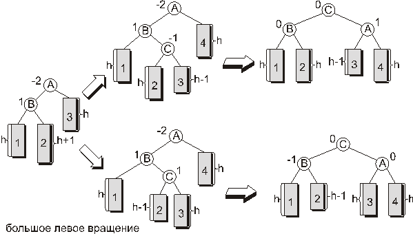Бинарные деревья поиска предназначены для быстрого доступа к данным. В идеале разумно сбалансированное дерево имеет высоту порядка O(log2n). Однако при некотором стечении обстоятельств дерево может оказаться вырожденным. Тогда высота его будет O(n), и доступ к данным существенно замедлится. Рассмотрим модифицированный класс деревьев, обладающих всеми преимуществами бинарных деревьев поиска и никогда не вырождающихся. Они называются сбалансированными или АВЛ - деревьями. Под сбалансированностью будем понимать то, что для каждого узла дерева высоты обоих его поддеревьев различаются не более чем на 1.