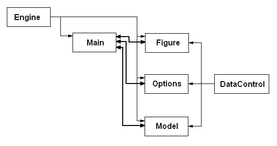 Main, Model, Options, Figure. Главной формой в программе является Main. В поле этой формы выводится изображение, так же с помощью нее осуществляется вызов, других форм. Форма Model служит для преобразований над сценой, камерой, источниками света. С помощью формы Options осуществляется настройка опций рендеринга. Форма Figure, служит для параметрического задания первой модели. Так как главная форма управляет всеми остальными формами, то модули этих форм должны быть подключены к Main. Но помимо этого все подформы должны иметь доступ к главной форме. Поэтому я установил двустороннюю связь между Main и модулями подформ.