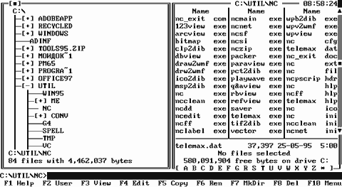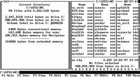 NORTON COMMANDER запускается файлом nc.exe (либо ncsmall.exe, ncmain.exe). После запуска программы высвечивает на экране в так называемом "окне" содержимое активного каталога. Для передвижения по "окну" можно использовать стандартные клавиши управления положением курсора (стрелки, {Del}, {Ins}, {Home}, {End}, {PgUp}, {PgDn}). Стрелки служат для перемещения курсора в активном "окне". Клавиши {PgUp} и {PgDn} служат для постраничному перемещению по тексту соответственно вверх и вниз (перелистывание экранных страниц). Клавиши {Home} и {End} предназначаются для перемещения курсора в начало и конец строки соответственно. Клавиша {Ins} выполняет подсветку (выбор) программ для последующего копирования удаления и т.д. Для отмены подсветки достаточно повторно нажать на {Ins}. Работает только с именами файлов и не работает с именами подкаталогов. Клавиша {Del} служит для удаления символа, на котором находится курсор. Последний при этом остается на прежнем месте, а символы справа от курсора сдвигаются на одну позицию влево. Для перехода в другой подкаталог достаточно подвести "подсветку" (highlight) к имени подкаталога (подкаталоги изображаются в окне заглавными буквами) и нажать клавишу {Enter}. После этого в окне будет отображено содержимое данного подкаталога. Содержимое второго окна останется без изменения - это окно НЕ активно. Для смены активного окна (т.е. окна, в котором производится работа) достаточно нажать клавишу {Tab} или {Ctrl - I}.Эта операция меняет активное окно. Для возврата в подкаталог предыдущего уровня надо подвести подсветку к имени подкаталога предыдущего уровня и нажать {Enter} или {Ctrl - PgUp} (первый способ не срабатывает, если командная строка не пуста, второй же способ игнорирует заполненность командной строки.