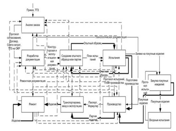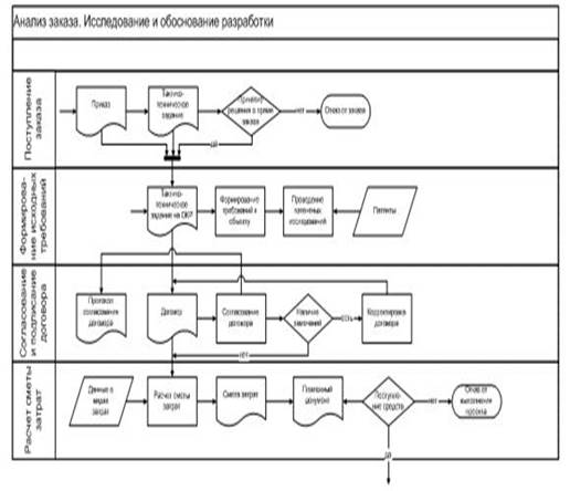 Был проведен анализ бизнес-процессов предметной области и выделены схемы, описывающие этапы жизненного цикла. Пример схемы бизнес-процессов для этапа анализа заказа приведен на рисунке 4. На этапе анализа заказа происходит формирование уровня качества изделий; изыскание принципов и путей, обоснование возможности и целесообразности создания системы; проведение работ заказчиком по формированию исходных требований к системам, комплексам, образцам, их составным частям и материалам в соответствии с директивными указаниями, фундаментальными, поисковыми научно-исследовательскими работами, отечественной и зарубежной информацией о достижениях науки и техники; заключение договора и оплата; разработка и выдача тактико-технических заданий на выполнение научно-исследовательских работ и опытно-конструкторских работ до начала выполнения исполнителями указанных работ.