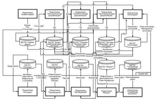 Фундаментом, как первой, так и второй информационной системой, является база данных. В силу различия функций двух информационных систем, базы данных имеют различную направленность. Производственная информационная сисема ориентирована на управление данными об изделии, в данном случае – турбоустановки, поэтому фактически является базой данных изделий. Информационная система обеспечения, которая ориентирована на подготовку производства и обеспечение его технологическими, финансовыми, людскими ресурсами, является базой данных предприятия. Система управления базой данных является единой как для базы данных изделий, так и для базы данных предприятия.