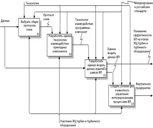 Вопросы интеграции данных и создания виртуального предприятия решаются соответствующей функцией (работой) – см. блок 2 на рисунке 7. Главной особенностью этой работы является наличие двух стрелок выхода: стрелка "Виртуальное предприятие" и стрелка "Повышение эффективности БП на этапах жизненного цикла турбин и турбинного оборудования", мигрировавшая с контекстной диаграммы. Интеграция данных о турбине и турбинном оборудовании, порождаемых на всех этапах, происходит в рамках виртуального предприятия . Управляющие воздействия для этой функции – требования стандартов (международных и российских) и возможности используемых технологий. В силу существенных различий во внутренних стандартах (ОСТах) предприятий-участников виртуального предприятия, их использование для задач интеграции данных нецелесообразно.
