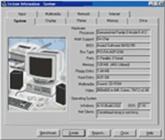 Среди пакетов сервисных утилит, без сомнения, "первым среди равных", является Norton Utilities выпускаемый фирмой Symantec и уже доросший до 2002-й версии. Входящая в пакет утилита System Information предоставляет удобно сгруппированную информацию по всем основным компонентам компьютера. Имеется возможность детализации информации по некоторым разделам, а так же сформировать отчет. Довольно наглядно и красочно, с использованием круговых диаграмм, оформлена информация об эффективности и использовании диска. Протестировать процессор можно, нажав кнопку Benchmark. Программа выдает график примерного быстродействия Вашей системы, за единицу измерения принимается производительность РС на базе процессора Intel 386SX-16MHz. Для сравнения даны рейтинги трех различных компьютеров. При всем моем уважении к действительно великолепному пакету Norton Utilities 2001, утилита System Information является весьма посредственным инструментом для получения исчерпывающей информации о компонентах системы, плюс к этому не очень наглядно, особенно в сравнении с двумя нижеописанными программами, отображаются сведения о системе, ну и совсем добивает своей примитивностью и не внушающими доверия результатами, тестовая подсистема программы. Результат - не более чем удовлетворительно.