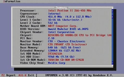 Informer 3.40 - очень неплохая отечественная разработка, предназначенная для анализа конфигурации компьютера и выдающая по ней подробный отчет. Программа предоставляет довольно широкие возможности анализа, так, по заявлениям разработчика, имеется возможность определения 110 типов процессоров и 19 - сопроцессоров, причем измерение тактовой частоты осуществляется с точностью 0.1МГц. Распознаются 2574 моделей мониторов, 324 производителей материнских плат, большое количество различных накопителей и AGP/PCI-устройств и определяются режимы их работы. Как недостаток можно отметить полное отсутствие возможности оценить производительность отдельных компонентов системы. Программа Informer предназначена для использования под управлением ОС DOS, поэтому ей присущи все издержки примитивного псевдографического интерфейса, но это в какой-то мере компенсируется очень скромными ее размерами - всего 200 Kb, что позволяет использовать утилиту с обычной дискеты. Informer, кроме DOS, прекрасно работает и под Windows 95/98/Ме. Распространяется бесплатно. Итоговую оценку можно определить как хорошо.