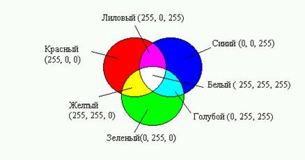 Чем больше значение байта цветовой составляющей, тем ярче этот цвет. При наложении одной составляющей на другую яркость суммарного цвета также увеличивается.