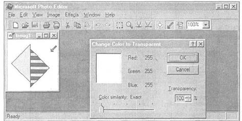 Для открытия окна, которое позволит выбрать нужный цвет, следует щелкнуть на кнопке Set Transparent Color (установить прозрачный цвет). Затем, когда указатель мыши превратится в наклонную стрелку, щелкните на нужном цвете. Обратите внимание, что в окне диалога показаны числовые характеристики выбранного цвета. Это можно использовать и для того, чтобы быстро узнать величины базовых цветов для любого оттенка, не устанавливая прозрачность в действительности.