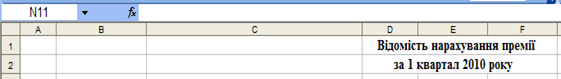 | 1 | Відомість нарахування премії за 1 квартал 2010 року | текст | D1 | " Відомість нарахування премії за 1 квартал 2010 року " | |