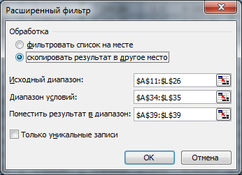 В діапазоні умов заголовок стовпця (11), за яким проводиться відбір, не повинен збігатися із заголовком початкового списку.