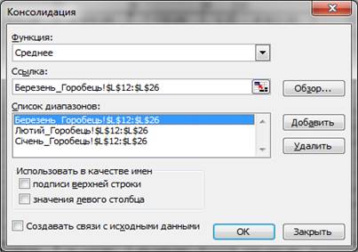 У списку “Функція ”вибрати функцію, що використовується при об’єднанні даних, - середнє.