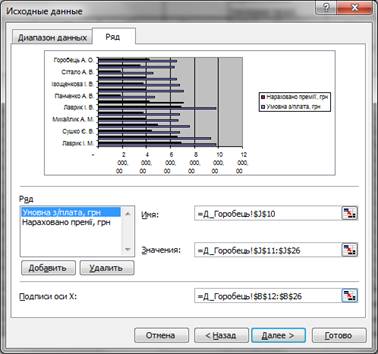 На робочому аркуші виділимо діапазони комірок (J10: J26, L10: L26) з даними Умовна з/плата та Нараховано премії (несуміжні діапазони виділяються за допомогою Ctrl ).