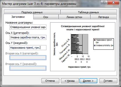 Крок 3 Ввести заголовки діаграми та її осей. Встановити параметри діаграми, пов’язані з її зовнішнім оформленням.