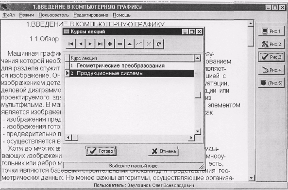 Область применения созданного программного продукта - дистанционное образование по специальности 220400 "Программное обеспечение вычислительной техники и автоматизированных систем" для дисциплин, связанных с компьютерной графикой и искусственным интеллектом. Возможно использование для других специальностей и других форм обучения, а также всеми желающими более детально изучить отдельные вопросы машинной графики, представления и использования знаний.