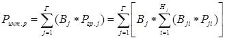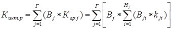 д) средневзвешенный, основанный на определении для каждого из параметров рейтинга, помимо приписывания баллов, коэффициентов весомости, то есть этот метод аналогичен комплексному методу оценки качества продукции (без проведения сравнительной оценки). При невозможности дать объективную оценку следует для каждой из групп параметров рейтинга определять свой групповой интегрированный рейтинг и на их основе – общий для системы в целом интегрированный рейтинг. В рамках каждой из групп коэффициенты целесообразно нормировать (сумма их значений должна быть равна 1). То же следует сделать для групповых коэффициентов весомости всей системы в целом. При этом для последнего случая формула определении интегрированного рейтинга в абсолютной форме СУ будет иметь следующий вид формула 1:
