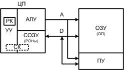 - устройство управления (УУ), которое выделяет последовательность сигналов контролирующих передачу информации между остальными устройствами в соответствии с содержимым регистра команд (РК), на который принимается очередная команда.