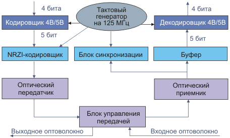 Рівень MAC (media access control) визначає доступ до мережевого середовища, включаючи формат кадрів, адресацію, алгоритм обчислення crc і механізм виправлення помилок. Рівень PHY (physical layer protocol) задає процедуру кодування / декодування, синхронізацію, формування кадрів і ін. Як базова використовується кодування 4b/5b (перетворення 4-бітової коди в 5-бітовий), а в каналі – NRZI. Рівень PMD (physical layer medium) визначає характеристики транспортного середовища, включаючи оптичні канали, рівні живлення, регламентує частоту помилок, задає вимоги до оптичних компонентів і роз'ємів. Блок схема інтерфейсу між рівнями MAC і PHY показана на Рис. 1.3.