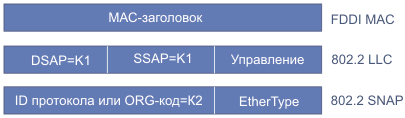 IP-дейтограми, ARP-запроси і відгуки, що пересилаються по мережі FDDI, повинні інкапсулюватися в пакети 802.2 LLC і SNAP (subnetwork access protocol; див. Рис. 1.4 і 1.5), а на фізичному рівні в FDDI MAC. Протокол snap повинен використовуватися з організаційними кодами, вказуючими, що SNAP-заголовок містить код Ethertype. 24-бітовий організаційний код (organization code) в snap має дорівнювати нулю, а останні 16 біт повинні відповідати Ethertype (див. assigned numbers, RFC-1700; IP=2048, ARP=2054).