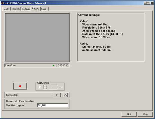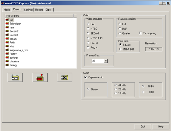Далее мы запускаем программу, идущую в поставке с видео картой, для оцифровки видео miroVIDEO Capture.