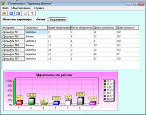 По результатам моделирования пользователь может производить анализ о количестве необходимых аппаратов, которые обслуживают клиентов, и об эффективности их работы.