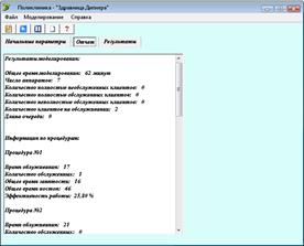 При остановке работы или после окончания процесса моделирования появляется отчет о проделанной работе. Его можно увидеть, если выбрать вкладку "Отчет" в главном окне программы (Рисунок 3.4). В нем указывается вся общая информация, информация по всем процедурам (Число обслуженных клиентов, время занятости, время простоя, эффективность работы). Если есть необходимость отчет можно сохранить в текстовом файле.