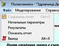 В вкладке меню "Файл" находятся команды: "Сохранить отчет", "Начальные параметры", "Результаты", "Показать отчет", "Выход" (Рисунок 3.5).