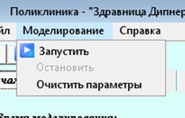В вкладке меню "Моделирование" находятся команды: "Запустить", "Остановить", "Очистить параметры" (Рисунок 3.6).